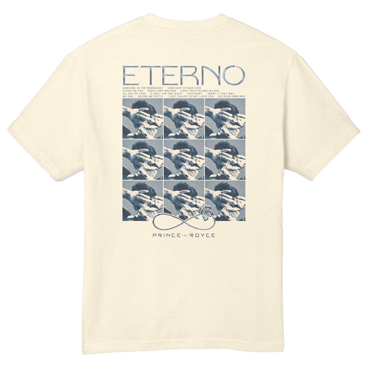 Prince Royce "Eterno" design printed front and back on a cream short sleeve t-shirt